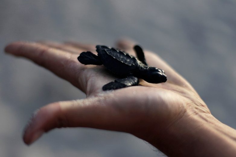 7. Новорожденная черепаха Гольфина сидит на руке добровольца, который поможет ей добраться до океана и защитит от хищников, пляж Сан-Диего в Ла-Либертад, Сальвадор.