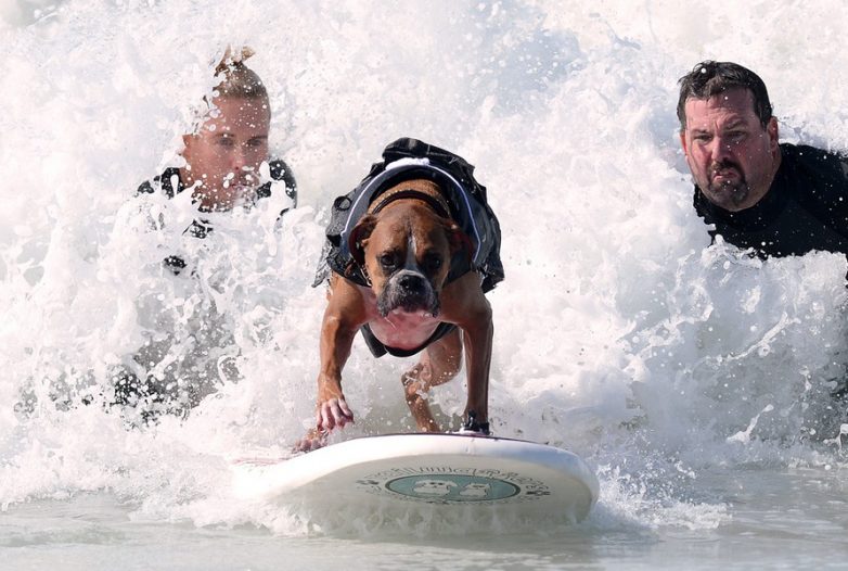 17. Ханзо, четырехлетний немецкий боксер, ловит волну во время ежегодного соревнования Surf City Surf Dog на пляже Хантингтон в Калифорнии.