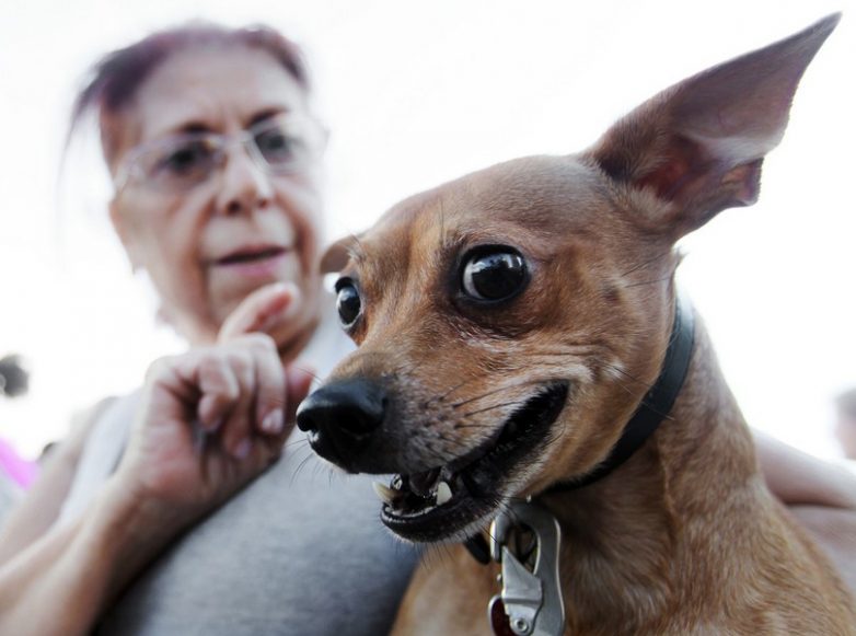 16. Католический священник благословляет домашних питомцев во время церемонии для животных около церкви Святого Франциска в Лиме.
