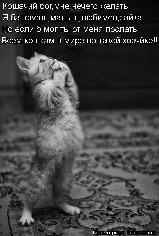 Какая подборка!!! Не могу остановить слёз! Сердце разрывается от жалости! Постоянно покупаю и ношу в сумке пакетики с кошачьей едой, но всех не накормить! Люди, если не можете взять домой, хотя бы не обижайте и подкармливайте бедных животных! У нас 2 кота. Первому уже 11 лет, он пришел ко мне под дверь в подъезде маленьким котенком, второму исполнился год, его во дворе бросила мама-кошка, все котята убегали от людей, а этот сам залез на колени к дочери, как было оставить его?? они самые любимые, самые прекрасные!