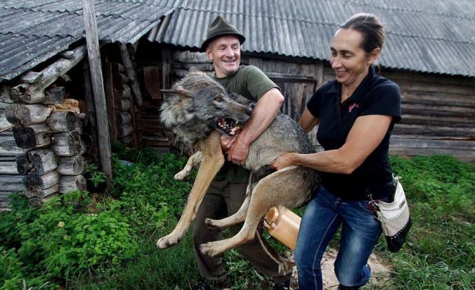 Отвечая на вопрос журналиста, чему можно было бы людям поучиться у волков, Елена подчеркнула, что они очень преданные. «У них преданность на генном уровне. То, что люди забывают, они помнят всю жизнь. Это не первый наш опыт с волками. Когда-то волк рос в вольере вместе с лайками на нашей усадьбе. Сибирские лайки — самые крупные из охотничьих собак, были мелкими по сравнению с ним. Среди 4 лаек был вожак. Когда он подходил, волк оставлял еду и отходил. Хоть по физическому статусу он мог этого кобеля растерзать. Потом этого волка передали в вольер Браславского национального парка, и он жил там около 10 лет. Все это время его кормил один и тот же человек, но, когда надо было делать прививку против бешенства, звали меня. Нашу семью волк помнил, и абсолютно мне доверял: вкалывала инъекцию под гриву абсолютно спокойно», — рассказала Елена.