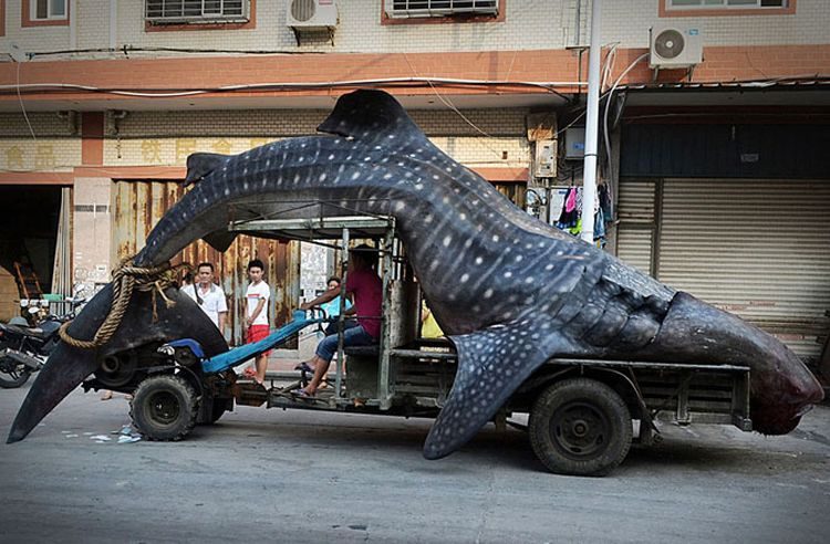 Житель городского округа провинции Фуцзянь (Китай) везет на своем грузовике пойманную сетью двухтонную китовую акулу.