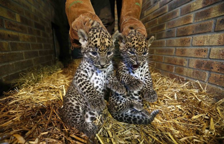 4. Два детеныша леопарда из Шри-Ланки, родившиеся 1 июля 2014 года, сидят в своей клетке в зоопарке Мобёж, Северная Франция.