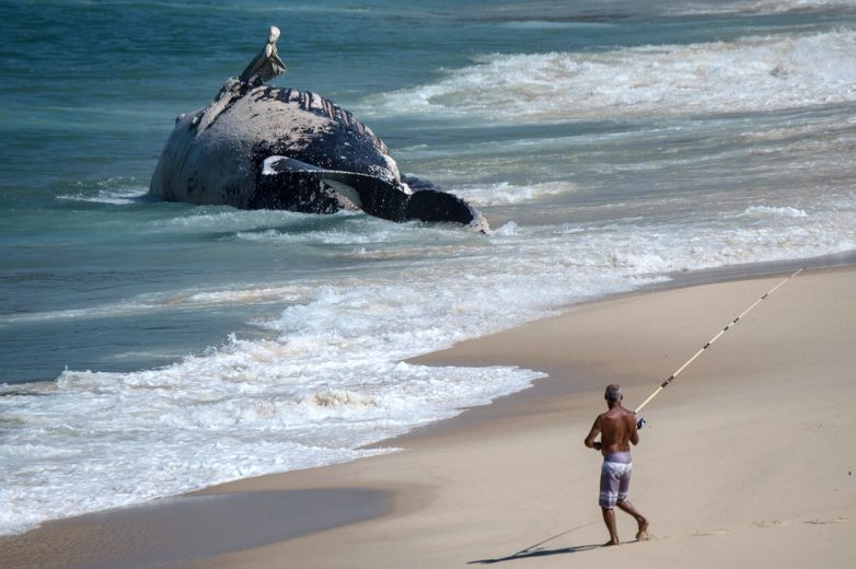 10. Рыбак ловит рыбу рядом с телом мертвого горбатого кита на пляже в Рио-де-Жанейро, Бразилиа.