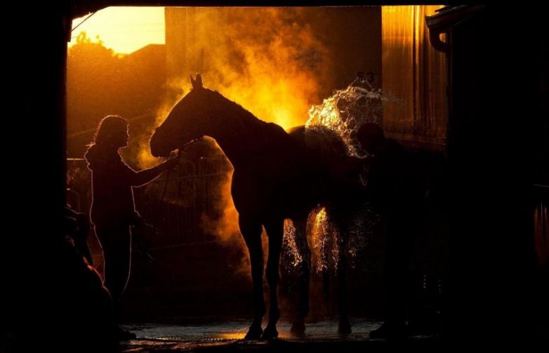 Лошадь купают во время восхода солнца перед утренней тренировкой на ипподроме в Торонто.