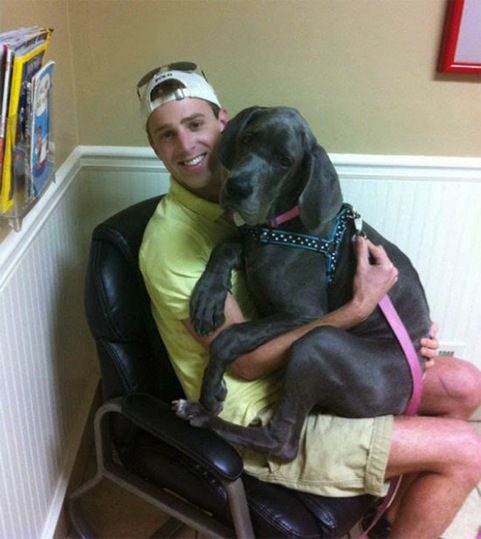 Моя догиня по щенячьей привычке пыталась мне на голову залезть. Она была уже давно взрослая могучая собачища более 80 кг!
