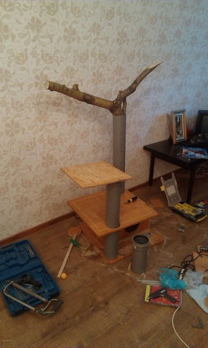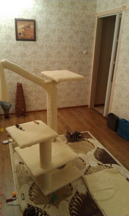 Ну домики эти как правило котам не особо нравятся (у меня каких только не было), пользуются частями сооружения. Самими домиками и лежанками. А вот одну идею парень мне хорошую подал. Взять ветку поразлапистей и верёвкой обмотать. Суперлазилка будет! Спасибо, Катерин и автор домика!