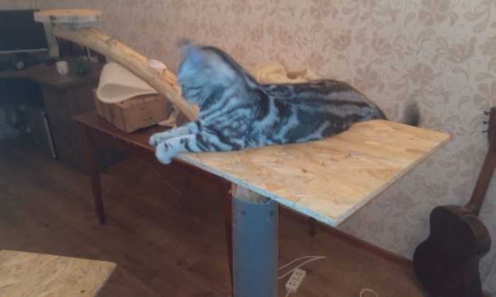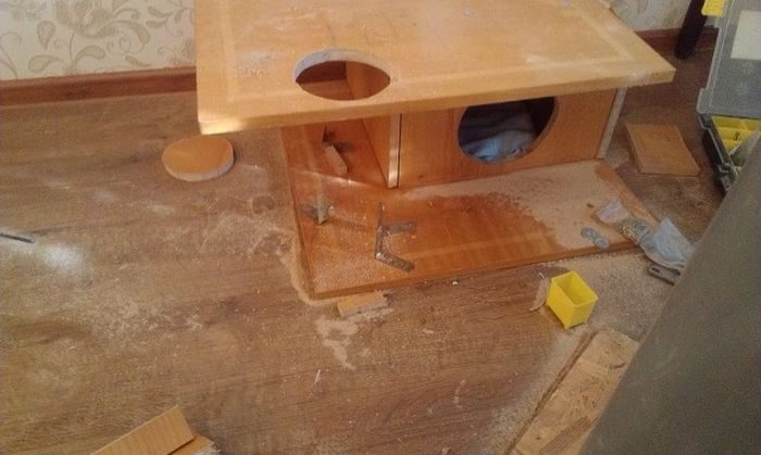 Если вы хотите порадовать своего любимого котика, и если у вас руки растут из правильного места, можете попробовать самостоятельно сделать такой специальный кошачий домик своими руками. Далее вы увидите фотоотчет о том, как один парень собрал в домашних условиях и из подручных средств отличный домик для своего питомца.