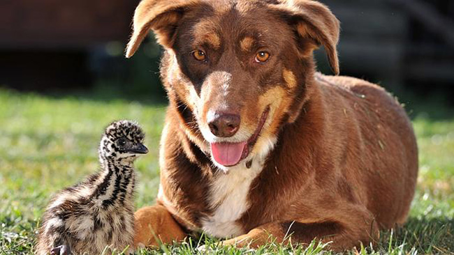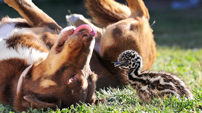 Эму для Чипа настоящие друзья, и он даже с ними играет.