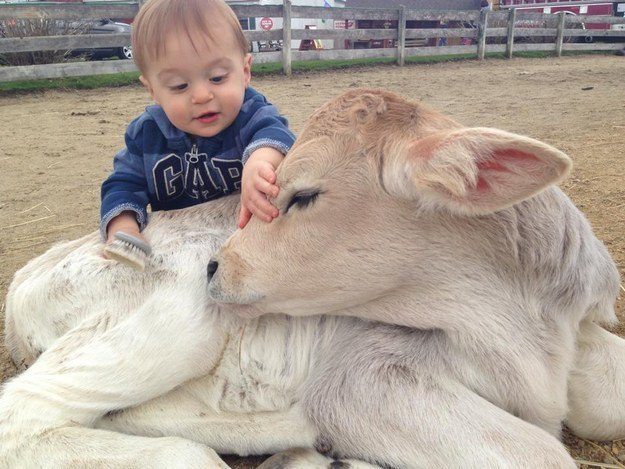 Теленок, которого тщательно причесывает его маленький друг.