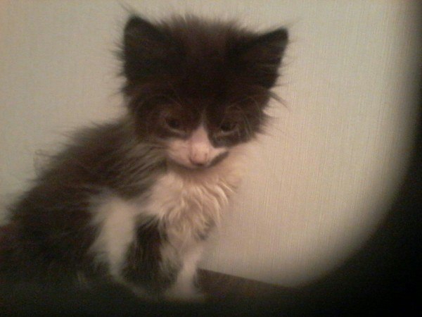 Этого «заморыша» я нашел в подъезде, когда переехал в новую квартиру.З накомство началось с того, что я чуть не наступил на него, когда открывал дверь (лампочка в подъезде, как обычно, «из эпсент»). На что маленький, но очень гордый мур-мурочный Мур-Мурыч, нагловато и уверенно заявил своё веское: «Мяу». Секунду поглядев на уверенный грязно-мохнатый комок, я решил взять его себе.