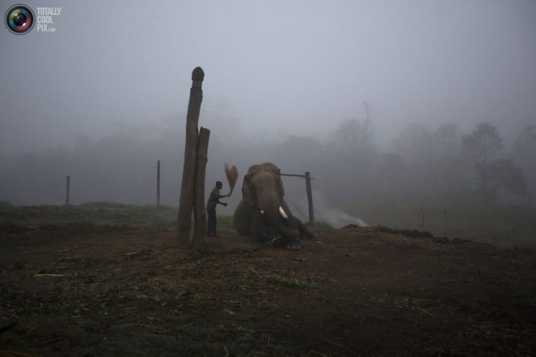 Погонщик чистит своего слона ранним утром в селении Саураха.