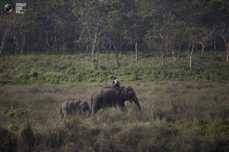 Слоны пасутся в Национальном парке Читван недалеко от селения Саураха.