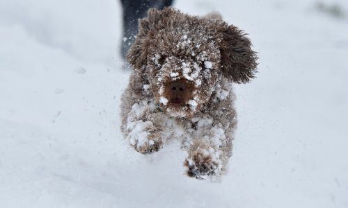 Испанская водяная собака во время прогулки обычным снежным днём, Белфаст (Великобритания).