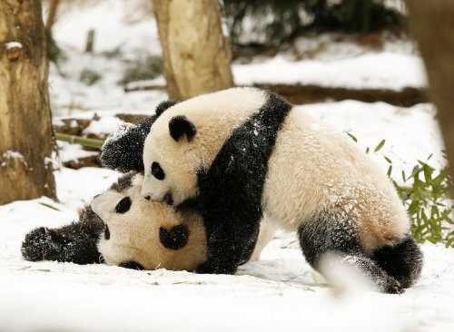 Детёныши панды борются друг с другом на снегу, Смитсоновский национальный зоопарк, Вашингтон (США).
