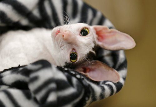 Участница породы корниш-рекс, приехавшая со своей хозяйкой на ежегодную выставку кошек, Калифорния
