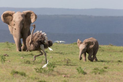 Слонёнок пытается догнать страуса, в то время как слониха пытается его остановить, Национальный парк слонов в Аддо (Южная Африка).
