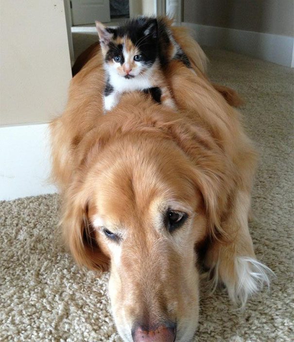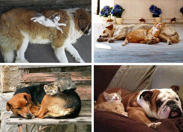 Слышали выражение «как кошка с собакой»? Эта заезженная фраза совершенно ничего не имеет с реальностью. Причем, многие кошки так хорошо ладят со своими большими друзьями, что даже умудряются использовать их в качестве подушки. Удобно и никто не обидит!;)
