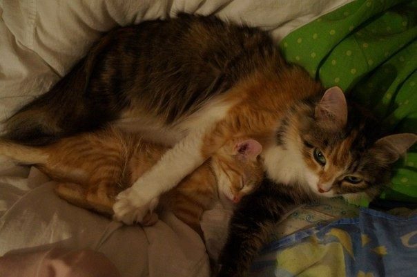 Боялась, что моя кошка начнет кидаться на него, так как она сразу проявила более чем активный интерес… Но то что произошло умиляет всю мою семью: кошка не просто не агрессивно к нему относится, а приняла как своего котенка (хотя никогда не рожала): когда малыш пытается вскарабкаться куда-нибудь, сидит внизу и как бы страхует, она ждет пока поест он, и лишь потом ест сама… А он уже два дня пытается отыскать у нее титьку, а она понимает, что не может ему ее дать, и только вылизывает с ног до головы…