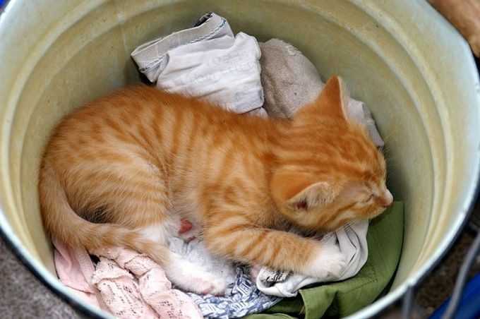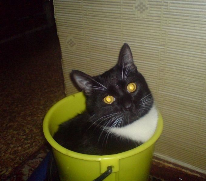 Где-то читала, что коты себя защищенными чувствуют когда окружены 3-мя стенками, отсюда и любовь к коробкам и… ведрам.