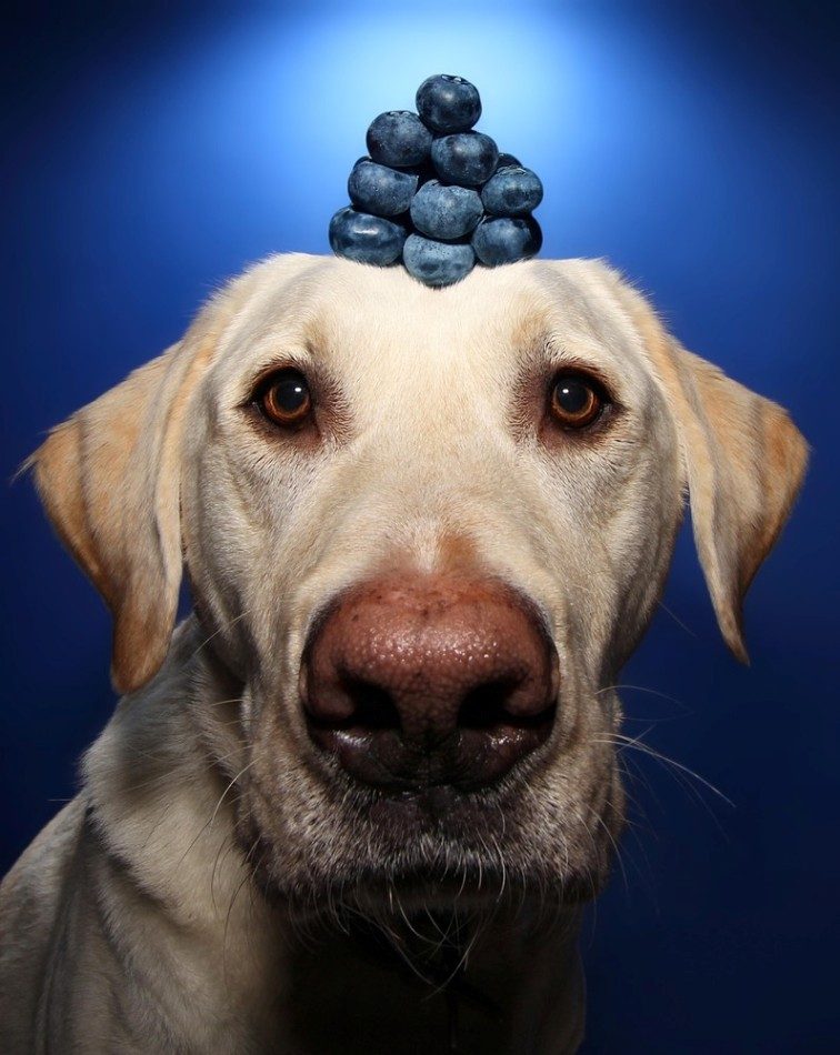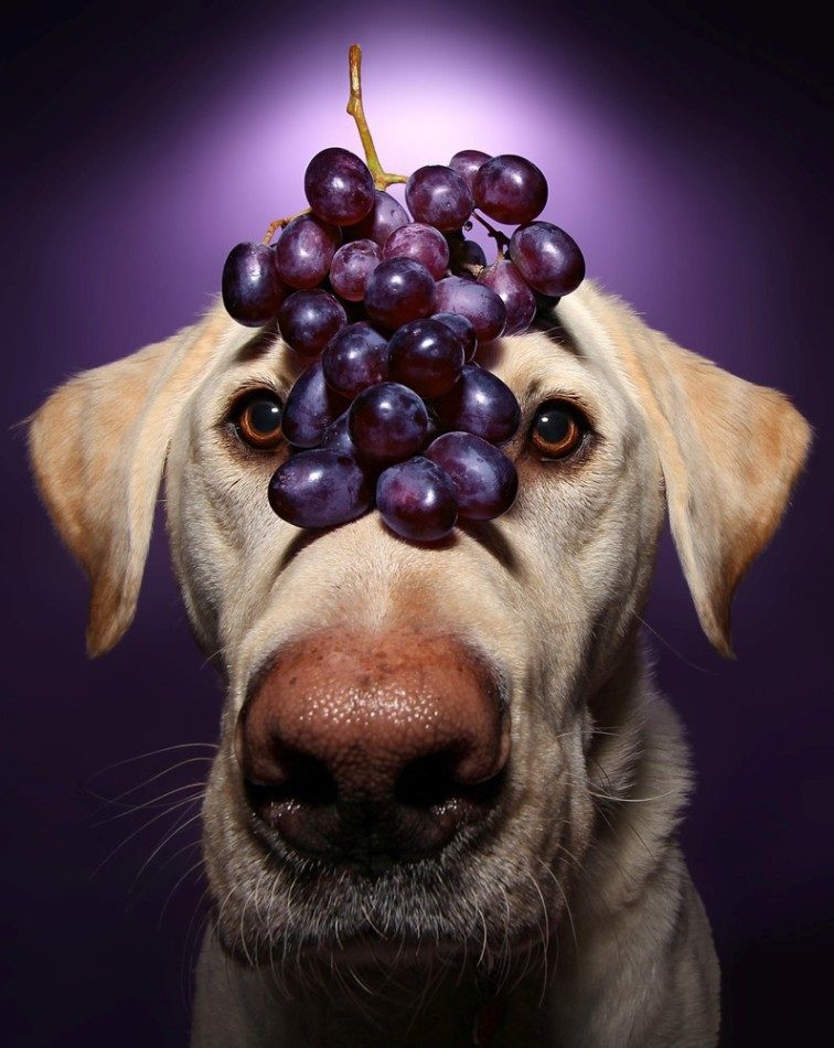 Верный пес Уинстон терпеливо позирует для создания его портрета с виноградом на голове.