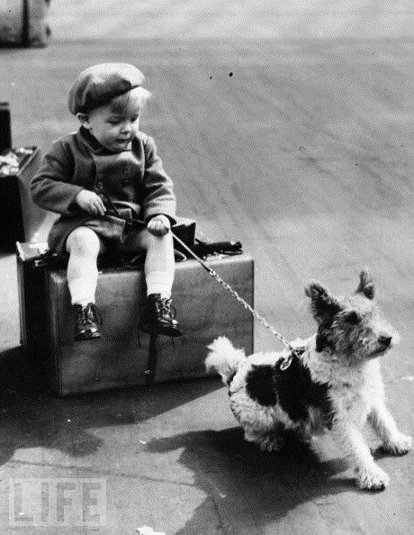 В ожидании эвакуации мальчик держит на поводке свою собаку, 1940 год. Большинство домашних животных, что не является секретом, во время войны были разлучены с хозяевами. Да и приюты для животных были часто закрыты или заброшены.