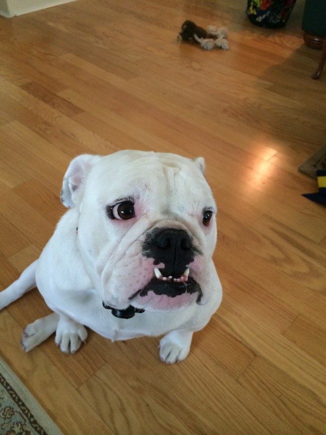Морда собаки, которая не видит разницы между ящиком с лакомствами и ящиком с бельем