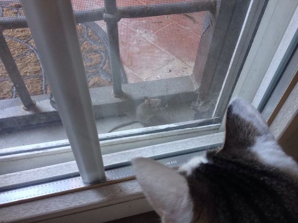 Плохо себя вел, поэтому отправили во двор. Теперь сидит на подоконнике, просится домой
