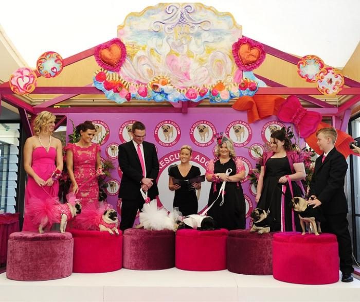 Свадьба состоялась на пляже в Мельбурне: более 60 гостей-собак и около 350 любителей мопсов стали свидетелями того, как пара обменялась обручальными ошейниками.