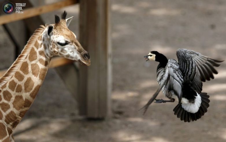 3. Гусь атакует новорожденного жирафа в частном зоопарке Pairi Daiza в Брюжлете, Бельгия.