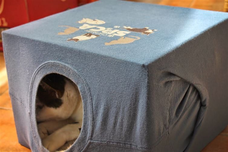 Гениальный способ подарить футболке, которую разодрал ваш питомец, вторую жизнь. Теперь у него будет уголок для уединения.
