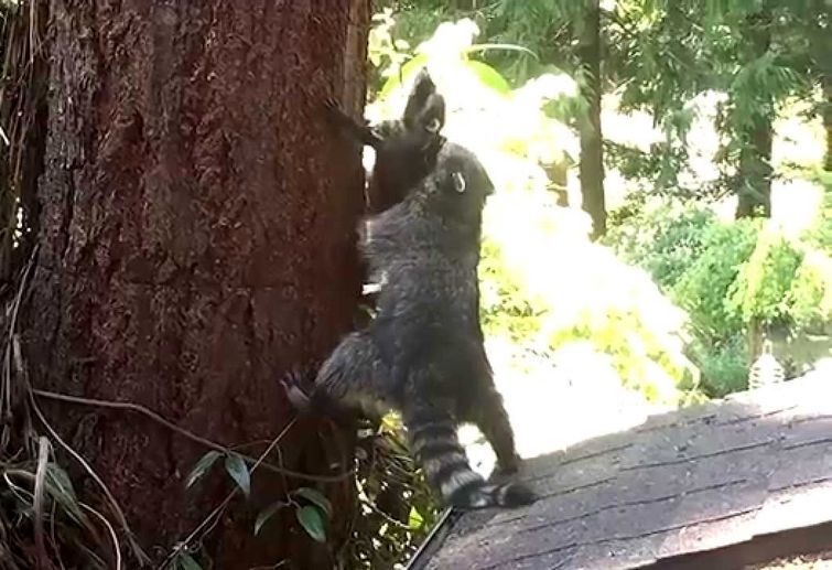 Сегодня вас ждет настоящий концентрат енотового умиления, ведь сегодня вы увидите, как мама помогает своему маленькому енотику научиться лазить по деревьям. Но похоже, что маленький енот вообще не понимает что происходит, и зачем ему надо учиться это делать, ведь ему и так нормально.