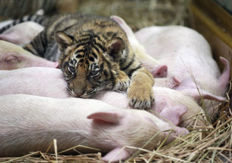 4. Хищные повадки. Тигренок с поросятами в парке в Гуанчжоу.