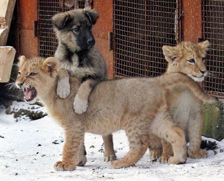 2. Два львенка и собака во дворе частного дома в Харькове.