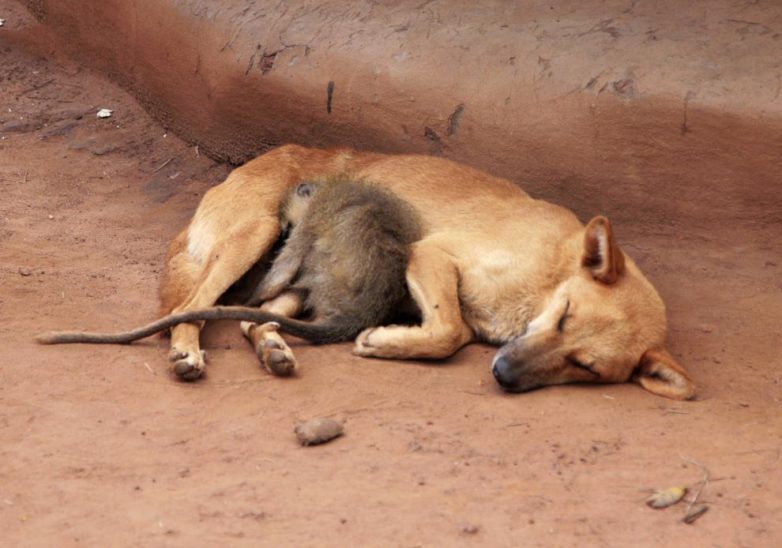 7. Сончас. Обезьяна спит рядом с собакой.