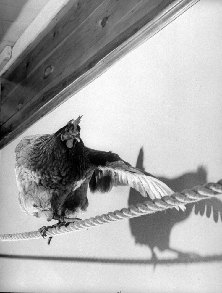 Курица поочерёдно расправляет крылья, чтобы держать равновесие. Несмотря на очевидную глупость, куры относятся к числу живых существ, которые легче всего поддаются дрессировке.