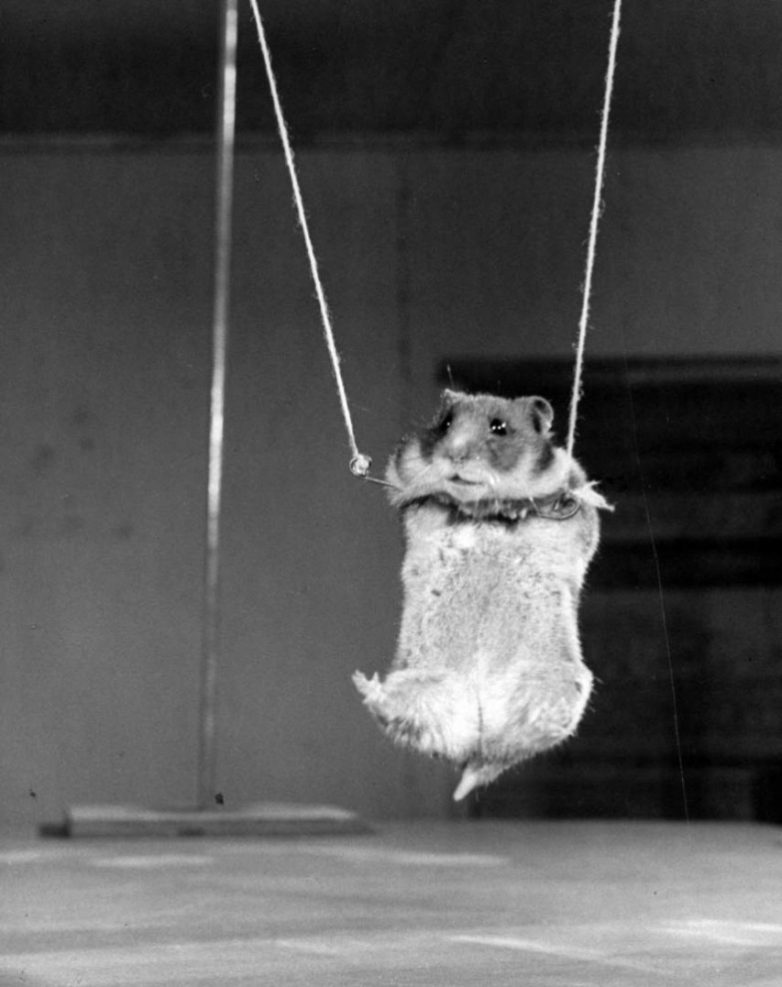 Удачно спустившись вниз на трапеции, хомяк спрыгивает на пол клетки, чтобы съесть приготовленное для него лакомство.