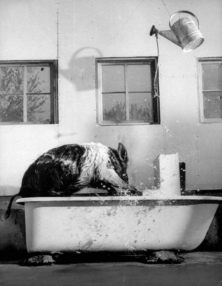 Свинья энергично плещется в ванной, разбрызгивая воду по всей комнате. Также она приучена убирать за собой, и пыталась отнести в мусорное ведро реквизит фотографа.