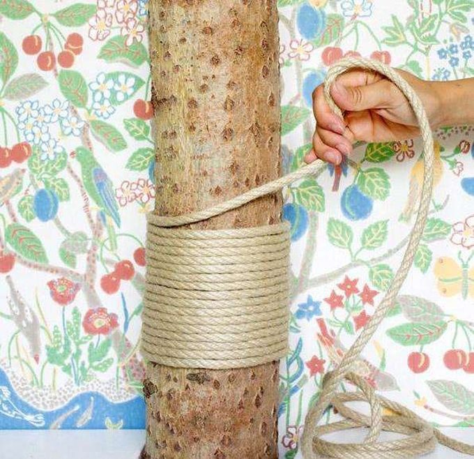 Можете использовать остатки старого дерева, прикрепить его дома или на даче, частично обмотать веревкой, чтобы кошки могли по нему лазить.