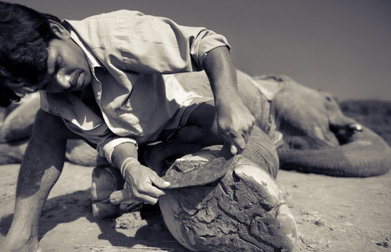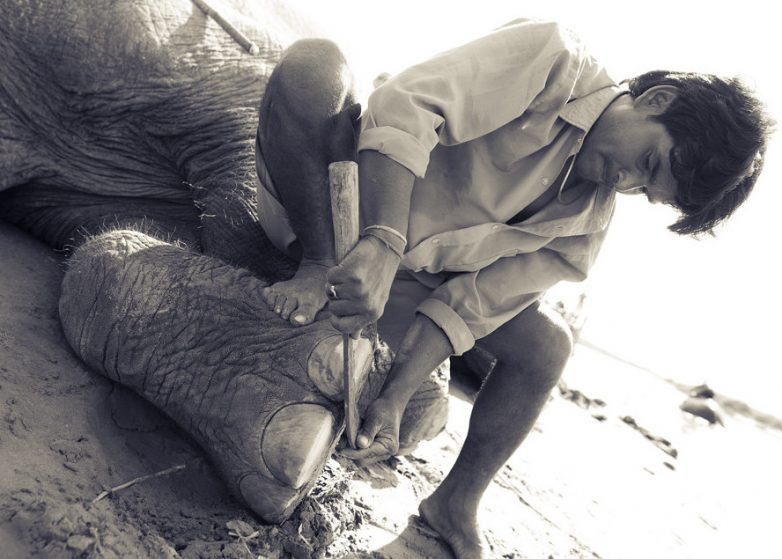 В национальном парке Читван (Непал) слонам делают педикюр. Конечно же, делается это не ради эстетической красоты, а лишь для того, чтобы расчистить роговые чехлы (их очень хорошо видно на первом фото), в которых скапливается очень много паразитов, удалить множественные натоптыши и мозоли.