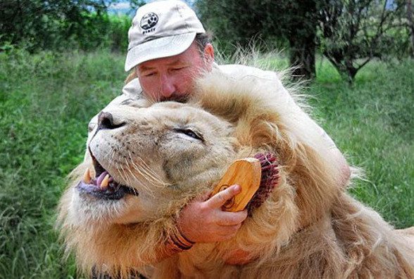 Он не только приближается вплотную к огромному хищнику, но еще и делает ему массаж «лапок». От процедуры лев приходит в полный восторг и становится похожим на большого котенка.