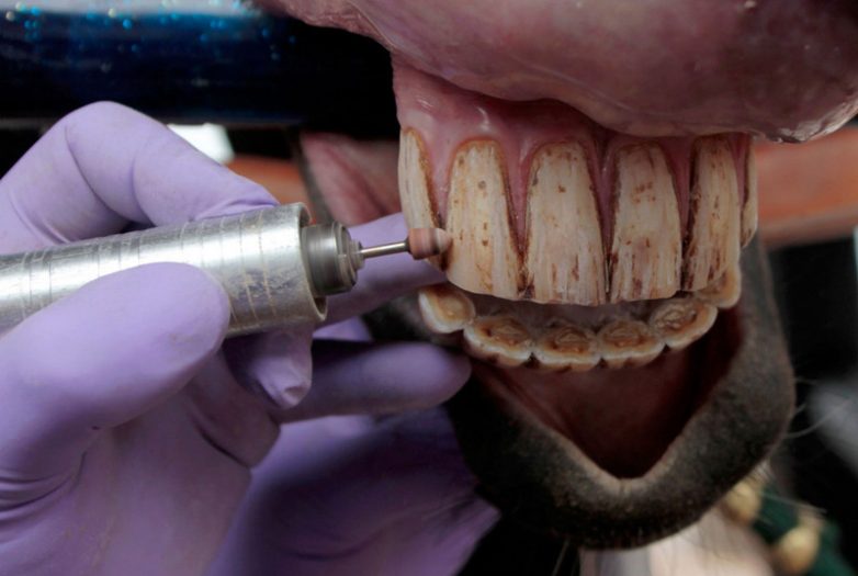 Стоматолог полирует зубы лошади в Боготе (столица Колумбии). Некоторые специалисты лечат зубы не только людям, они также предоставляют стоматологические услуги лошадям, которые участвуют в различных соревнованиях (дэрби). Лошадь обычно проходит лечение два раза в месяц в течение полугода (каждый такой прием обходится владельцу в 170$).