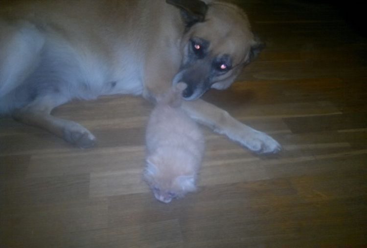 И у меня собака (13 лет) и котёнок, кошечка, среди ночи сама в открытое окно запрыгнула. Ей месяца два. Уже 1,5 недели живёт. Вывела её на улицу воздухом подышать, а она в меня вцепилась, даже с рук не спрыгнула.