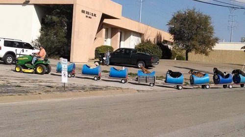 Сначала он катал на своём тракторе 4-5 собак, но когда показалась ещё парочка заинтересованных ушей, пришлось придумывать специальный вид транспорта, чтобы поместились все желающие. Тогда он взял пластиковые бочки, вырезал в них дырки и прицепил к ним колёса, превратив каждую в отдельный вагончик.