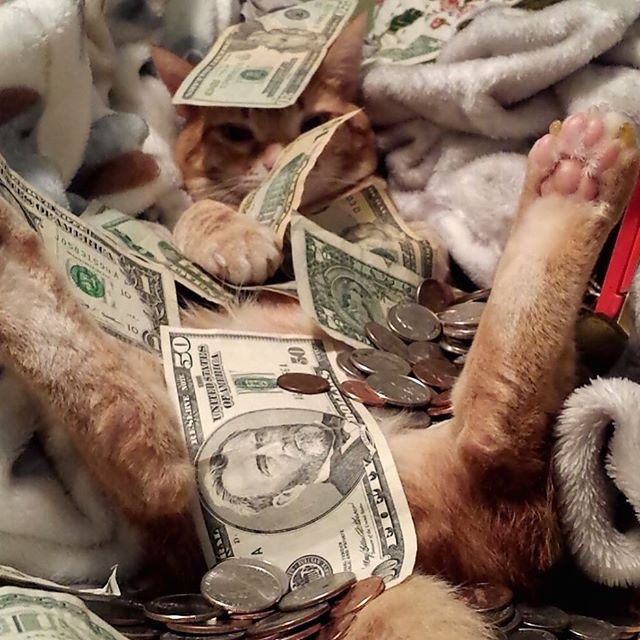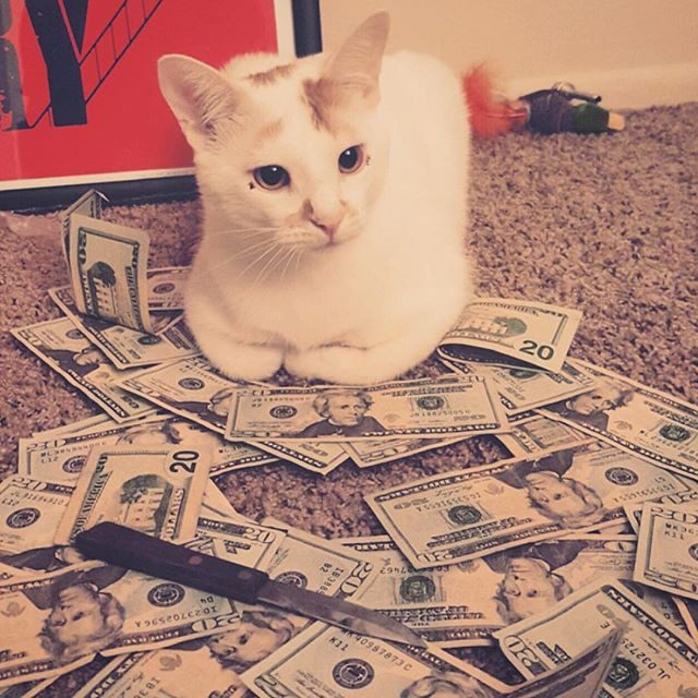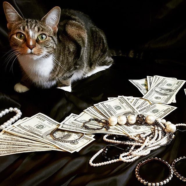 никогда не думала, что считается богатством — если твой кот лежит на «деньгах»,… да еще и с оружием… глупость!