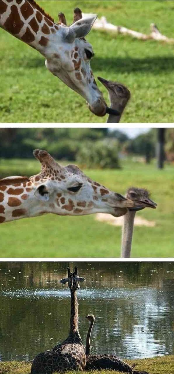 Животные бок о бок бродят по заповеднику Буш Гарденс в штате Флорида. Работники заповедника заметили необычную дружбу, которая завязалась между жирафом и страусом. Оба животных так сильно любят друг друга, что иногда даже лежат вместе, свернувшись в клубок.