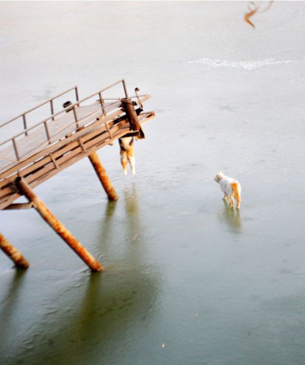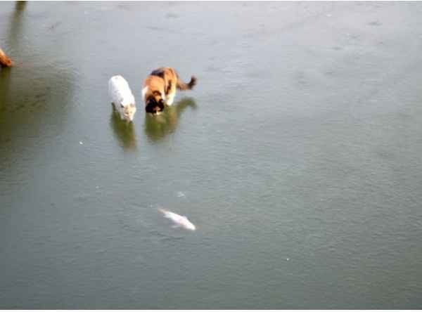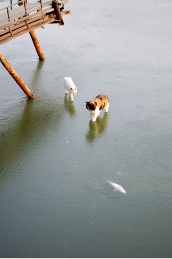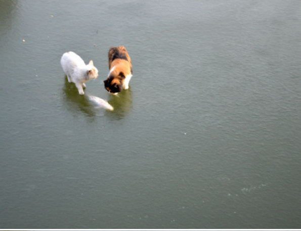 Коты оказались в полном замешательстве, когда оказались на поверхности замерзшего озера.