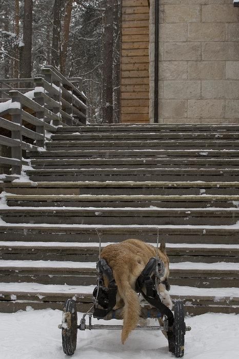 Илья выписал две тележки у K-9 Carts и на них теперь раскатывают две собаки с перебитыми позвоночниками – Муша…