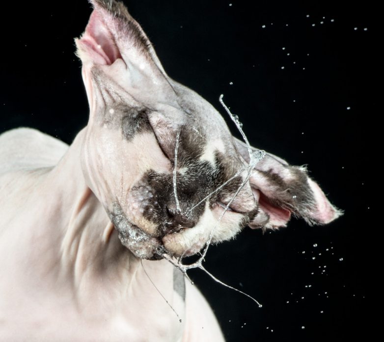 После того, как собаки или кошки привыкнут к студии и полностью в ней освоятся, фотограф просто гладит их влажными руками, и этого достаточно, чтобы животные начали отряхиваться. Также, случалось, он ловил такие моменты во время обычной гигиенической процедуры, когда кошкам чистили ушки.