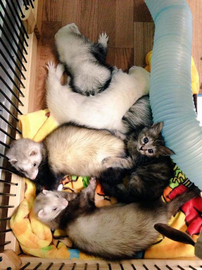 Любо-дорого смотреть на такую дружную семью, тем более, что в семье хорьков — котенок!!! Людям бы так дружно жить и заботиться друг о друге!!!